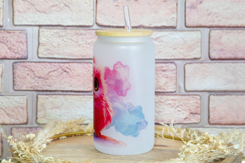 Matná sklenice na nápoje s víčkem a potiskem – růžová sova
