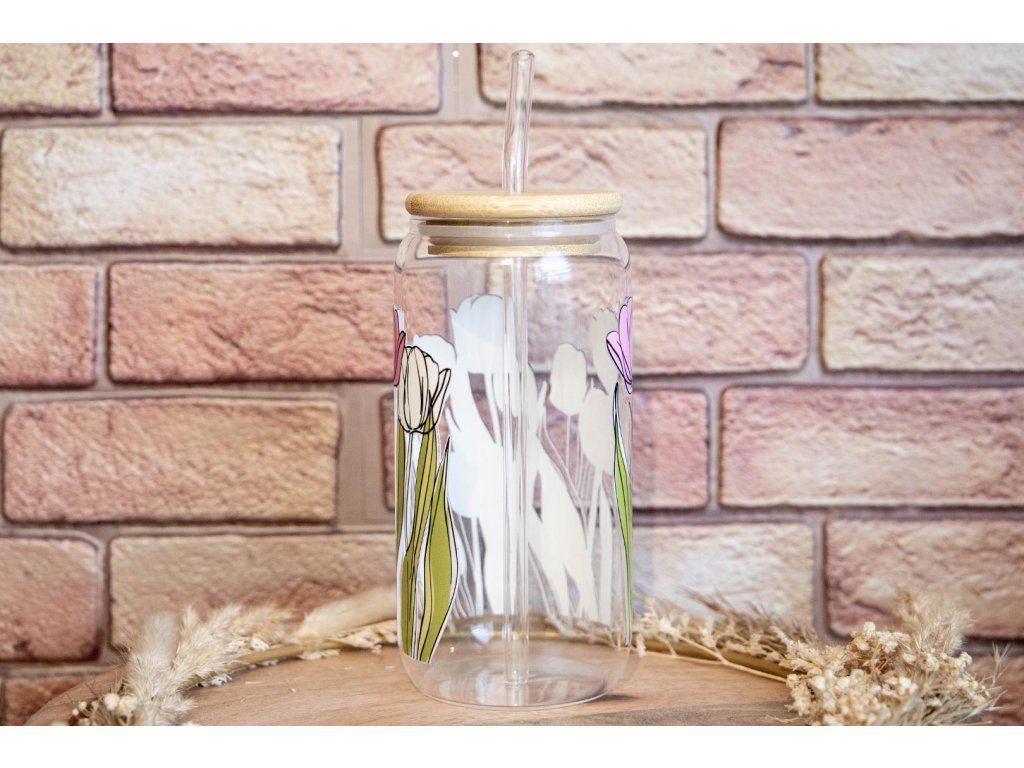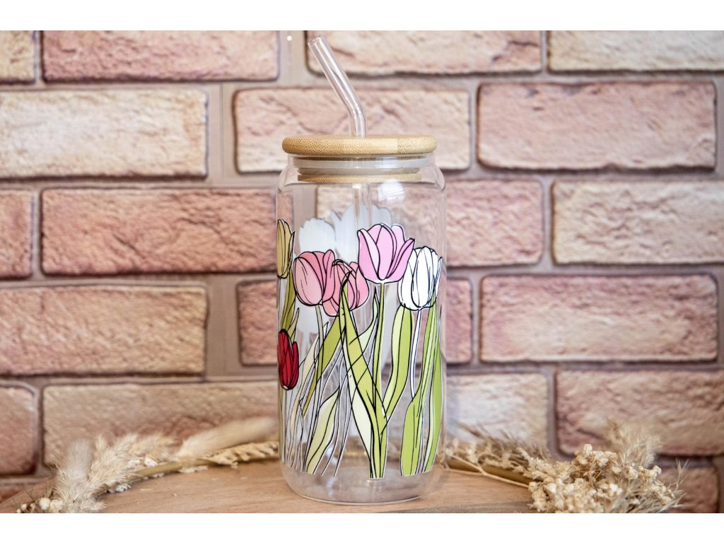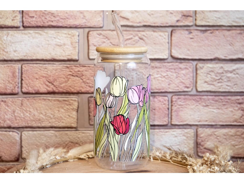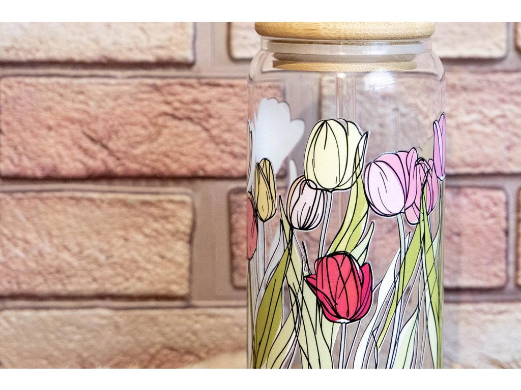 Sklenice na nápoje s víčkem a UV DTF polepem – tulipány