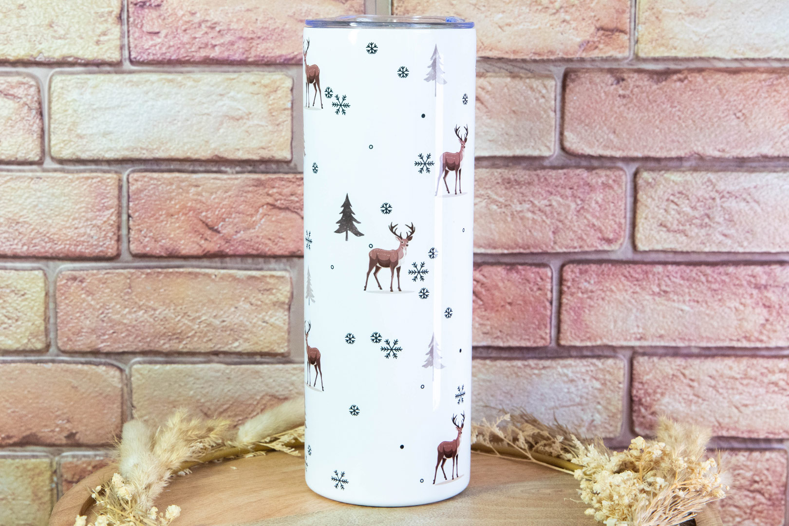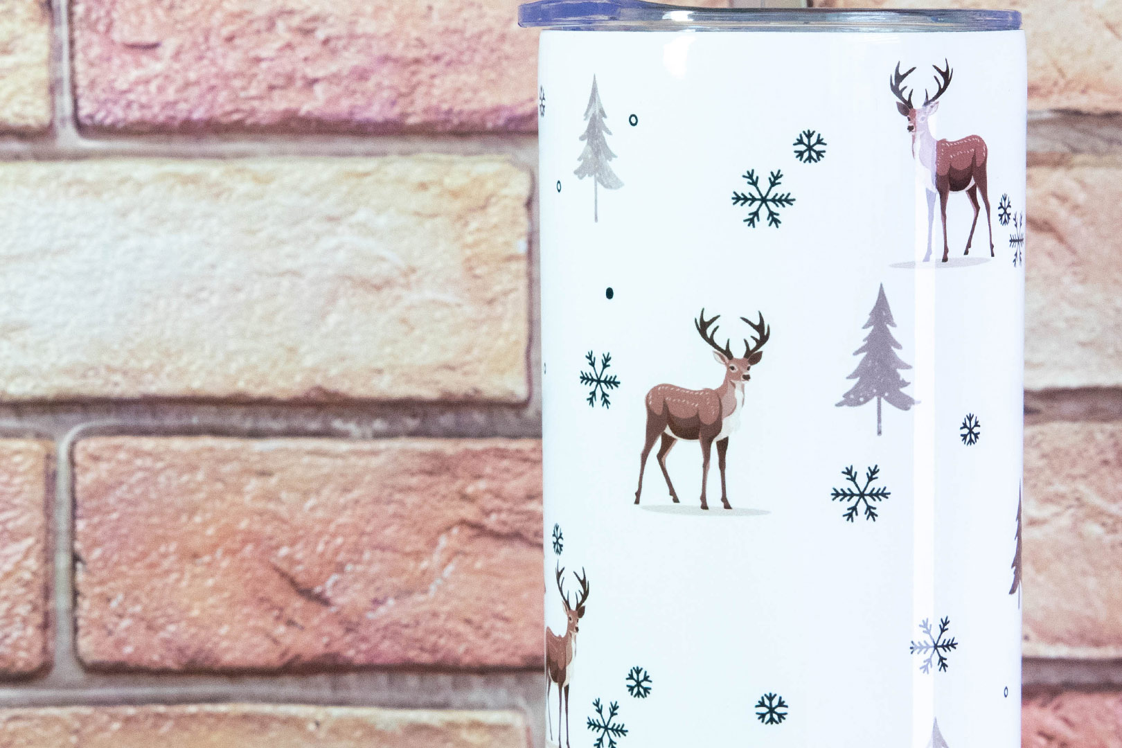 Stylový termo kelímek KudrnkaART se zimním motivem s jeleny – pro horkou kávu i ledové drinky. Design, co má duši, a funkčnost, co vydrží.